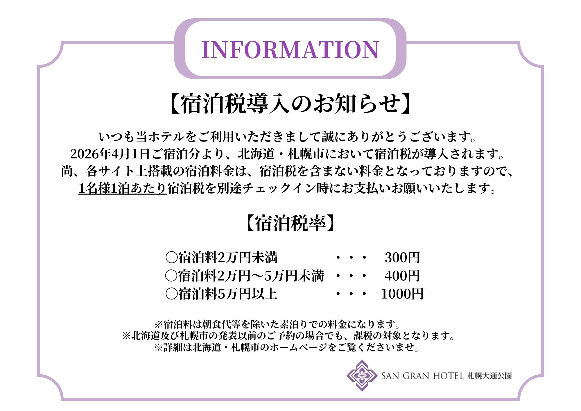 2026年2月12日 UP| 宿泊税導入のお知らせ いつもSAN GRAN HOTEL札幌大通公園をご利用いただき誠にありがとうございます。 2026年4月1日ご宿泊分より、北海道・札幌市において宿泊税が導入されます。 尚、各サイト上搭載の宿泊料金は、宿泊税を含まない料金となっておりますので、 1名様1泊あたり宿泊税を別途チェックイン時にお支払いお願いいたします。